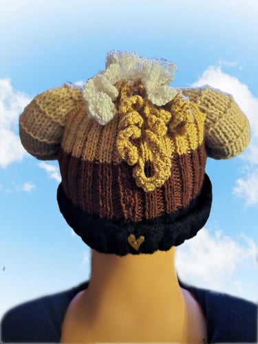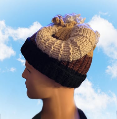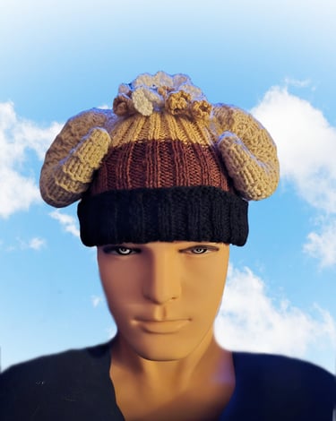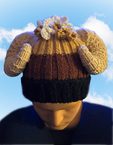 Personalised hand knitted beanie in various knit styles (will supply options on enquiry) up to 3 colours start at £25 (complex/elaborate knits will be more), add horns, ears, hair, eyes, face, tail for additional cost. Ram example below would cost £45 + UK postage.